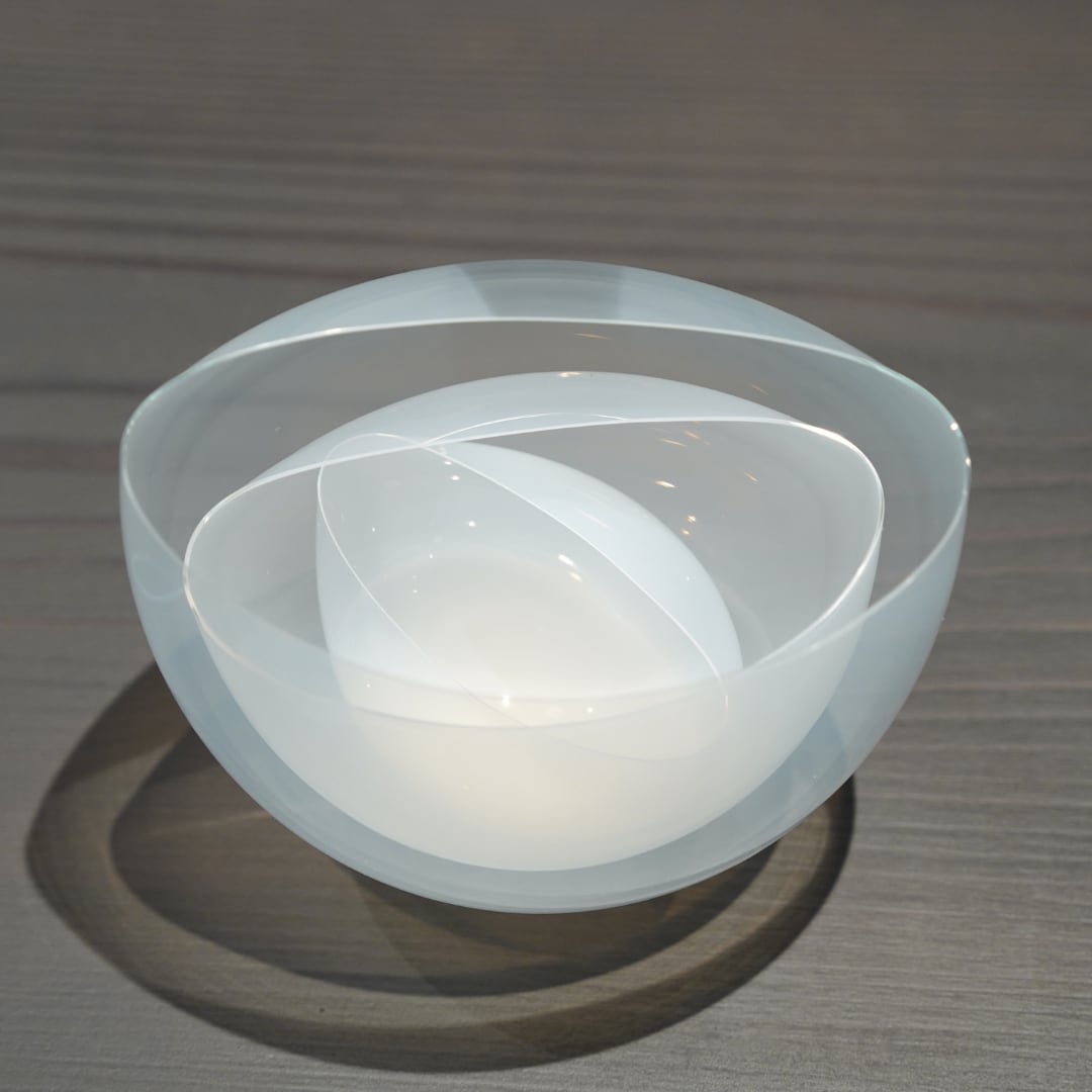 極限まで薄く引き伸ばされたガラスが織りなす、繊細で緊張感あふれる造形美を特徴としています。自然な重力と熱による変形が生み出す柔らかな曲線は、光を透過し反射することで、見る者の内面に静かに語りかけるような佇まいを見せます。