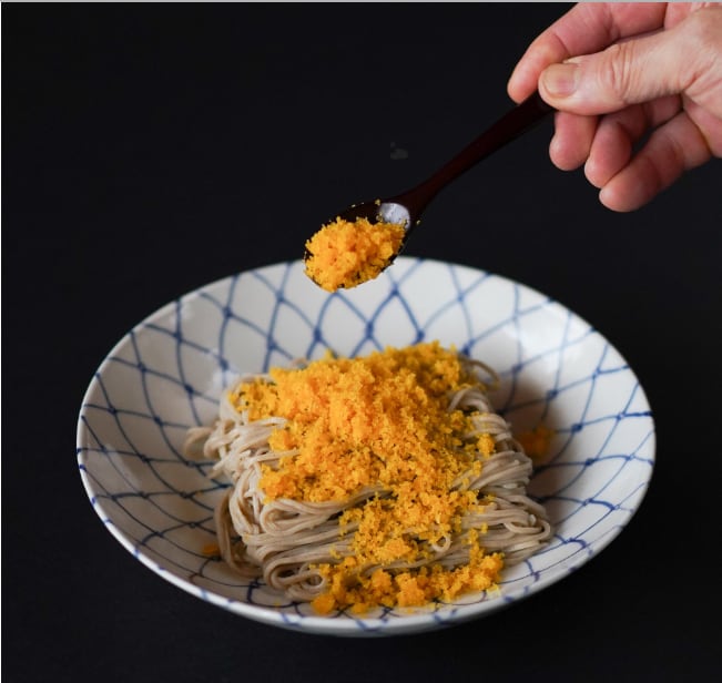 茹で上げた蕎麦に、すりおろしたからすみをたっぷりとかけてお楽しみください。